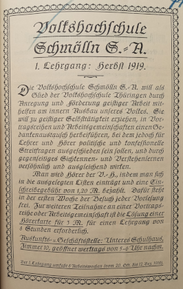 Als erste Einrichtung nimmt am 17. Oktober 1919 die Volkshochschule Schmölln ihre Arbeit auf. Erster Leiter ist Rudolf Seyfarth. Den Eröffnungsvortrag hält die Pädagogin und Politikerin Marie Schulz aus Gera zum Thema „Goethes Faust im Lichte unserer Zeit“. Während der folgenden Jahre führt die Volkshochschule Schmölln fortlaufende, acht- bis zehnwöchige Vortragsreihen durch und bietet verschiedene Arbeitsgemeinschaften an.